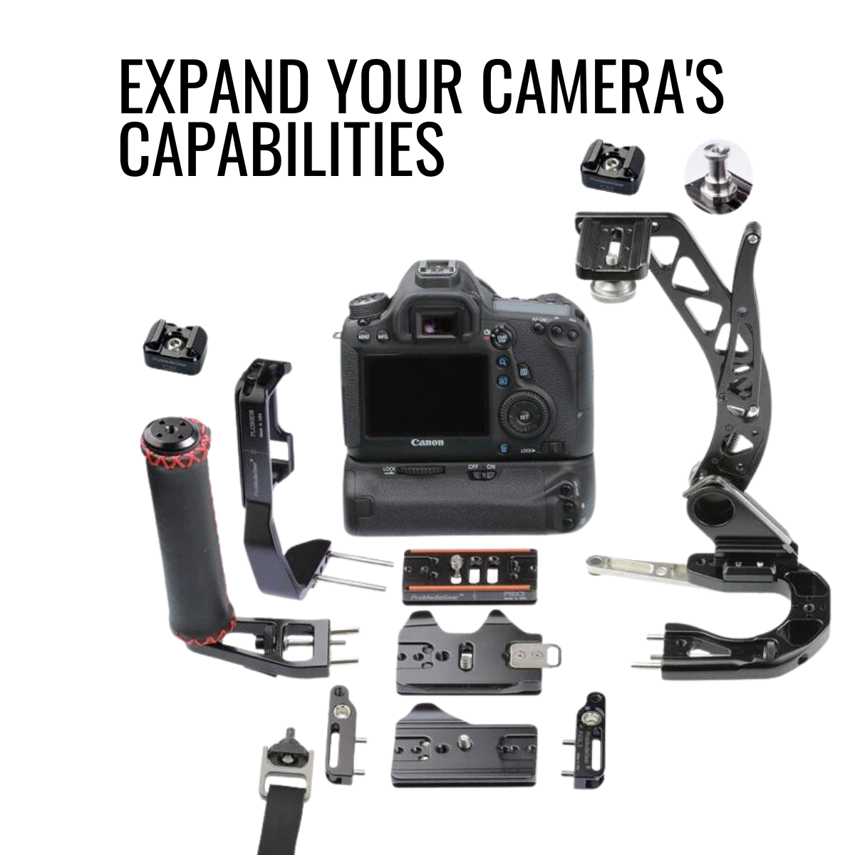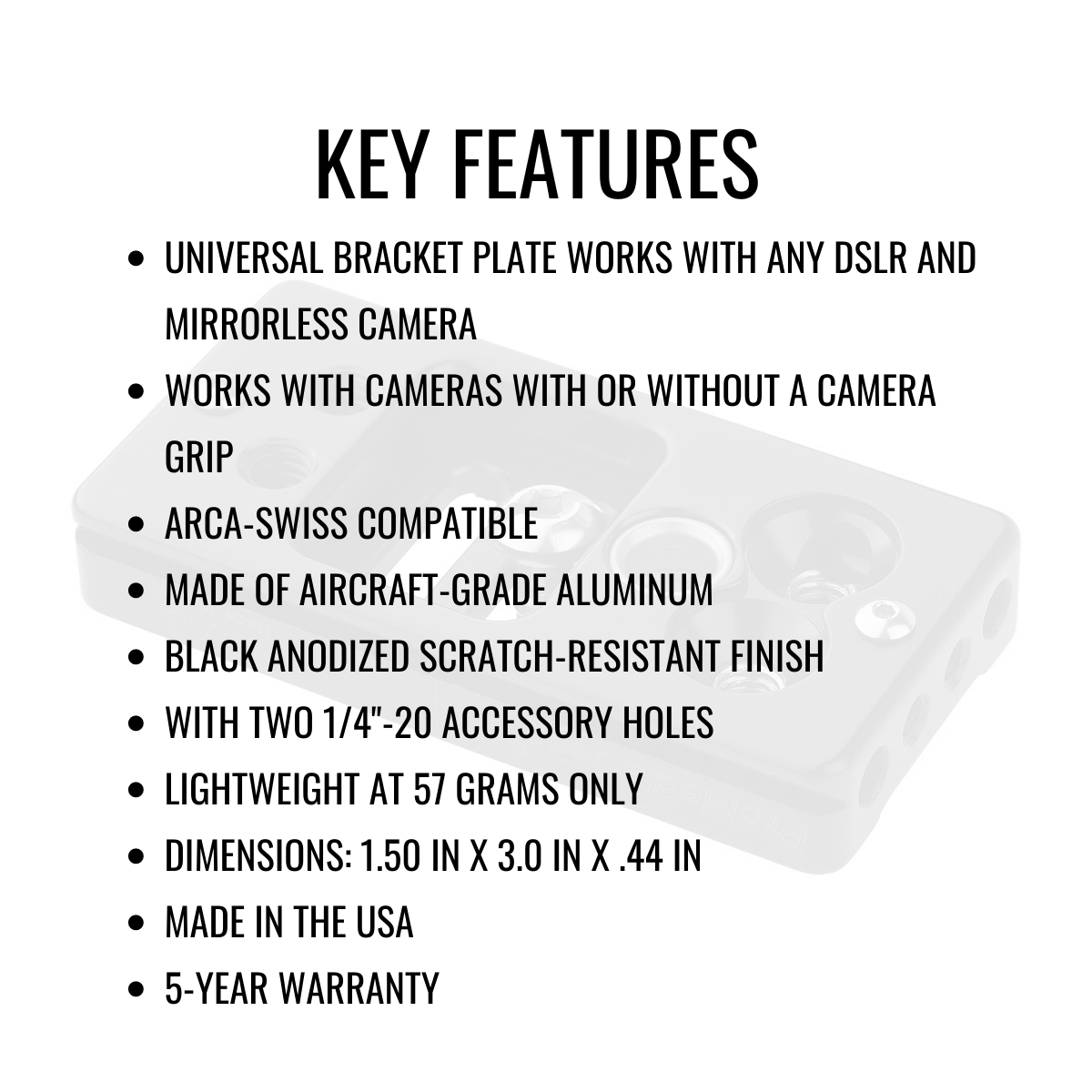 The ProMediaGear PBX3 Universal Bracket Plate for DLSR and Mirrorless. Compatible with Arca-type clamps. Made in USA with a 5-year warranty.
